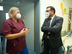 – Bayerns Gesundheitsminister Klaus Holetschek im Gespräch mit Gesundheits- und Kinderkrankenschwester Agnes Greiner auf der Mutter-Kind-Station.