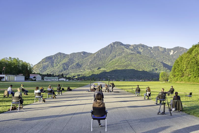 Es ist Donnerstag, 7. Mai, 19 Uhr, die Abendsonne wärmt das weite Feld des Segelflugplatzes in Unterwössen. Auf der Startbahn allerdings kein Segler sondern 35 Stühle mit 4 Meter Mindestabstand, eingerahmt von rot-weißem Flatterband. Vor 35 Fans und über zehn Helfern spielen Florian Starflinger (Geige) und Kamil Müller (Gesang) von Django 3000 ausnahmsweise in der Duobesetzung. Was für eine Stimmung: beschaulich, fast andächtig hallt inmitten dieser Bilderbuchlandschaft ihr Echo von den Unterwössener Gipfeln. Welch Kulisse für ein deutliches Zeichen. Nach sieben Wochen Total-Shutdown im Kulturleben zeigen die beiden Chiemgauer Musiker, die mit Hits wie „Heidi“ schon um die halbe Welt tourten, dass man auch kreative Lösungen finden kann, um Kultur in diesen Zeiten wieder aufleben zu lassen. Eine Versammlung zum Beispiel. Die sind seit 4. Mai erlaubt, mit bis zu 50 Leuten.