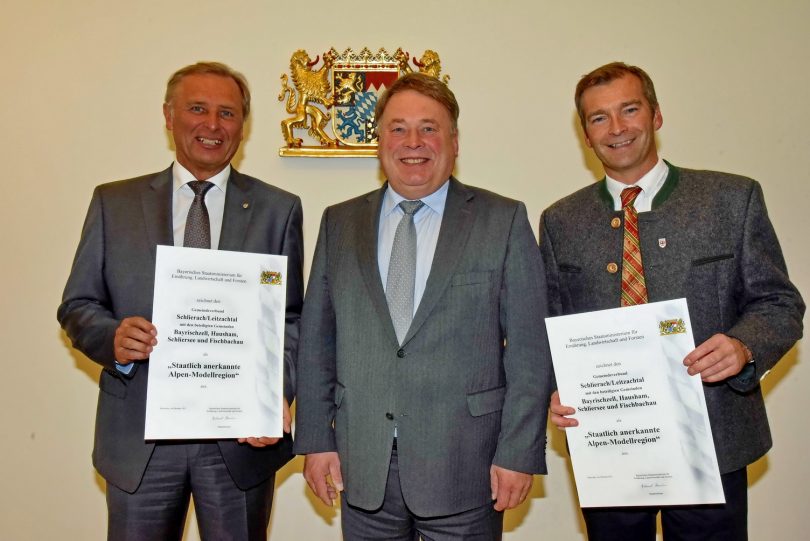 Landwirtschaftsminister Helmut Brunner hat heute in München dem Gemeindeverbund Schlierach/Leitzachtal im Landkreis Miesbach mit den Gemeinden Bayrischzell, Hausham, Schliersee und Fischbachau ihre Urkunden als „Staatlich anerkannte Alpen-Modellregionen“ überreicht. „Sie haben innovative, spannende Ideen entwickelt und Akteure mobilisiert, die diese engagiert und tatkräftig umsetzen wollen“, so der Minister. Die Alpen-Modellregion hatte erfolgreich an einem Wettbewerb teilgenommen, den Brunner im Frühjahr im Rahmen der bayerischen Alpenstrategie ausgelobt hatte. Mit ihren vielversprechenden Konzepten hatten sie eine zwölfköpfige Jury mit Experten aus Land- und Forstwirtschaft, Tourismus, Kommunalpolitik, Regionalentwicklung, Vermarktung, Berglandwirtschaft, Ländlicher Entwicklung sowie Umwelt- und Naturschutz überzeugt. Bei der Umsetzung der Konzepte wird den Kommunen zwei Jahre lang eine Projektbetreuung zur Seite stehen, deren Kosten zu 75 Prozent der Freistaat übernimmt.