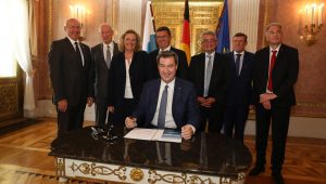 Ministerpräsident Dr. Markus Söder, MdL (Mitte), unterzeichnet den „Pakt für berufliche Weiterbildung 4.0“.