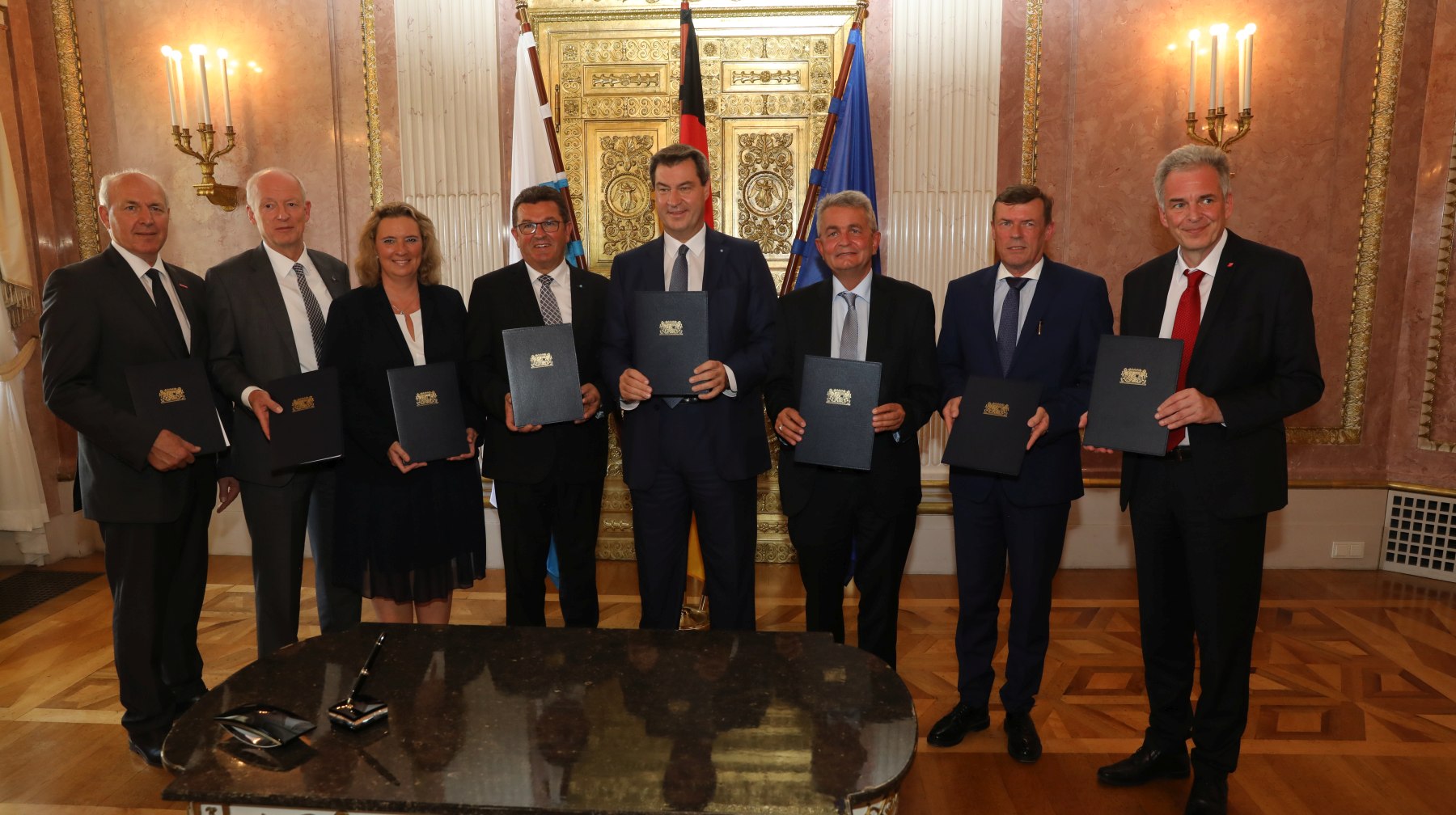 Nach der Unterzeichnung: Der Präsident des Bayerischen Handwerktags Franz-Xaver Peteranderl, der Hauptgeschäftsführer des Bayerischen Industrie- und Handelskammertags Peter Driessen, Arbeitsministerin Kerstin Schreyer, MdL, Wirtschaftsminister Franz Josef Pschierer, MdL, Ministerpräsident Dr. Markus Söder, MdL, der Hauptgeschäftsführer der vbw Bertram Brossardt, der Vorsitzende der Geschäftsführung der Regionaldirektion Bayern der Bundesagentur für Arbeit Ralf Holtzwart und der Vorsitzende des Deutschen Gewerkschaftsbunds Bayern Matthias Jena (v.l.n.r.).