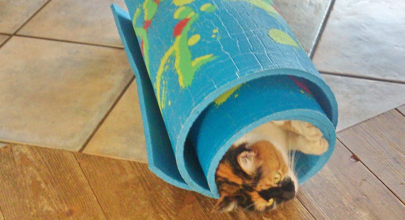 Entspannung will geübt sein und den richtigen Platz dazu suchen und finden, das ist auch eine kleine Kunst – alles zusammen gelang dieser Katze Minousch als sie sich bei einem Yoga-Trainiung den Gelassenheits-Suchenden anschloss und gleich mit der Mappe einrollte.
