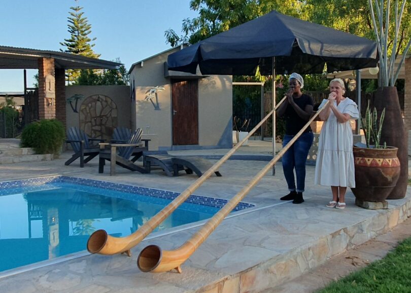 Während unseres Aufenthalts im Etosha Nationalpark blieben unsere Alphörner selbstverständlich im Auto verstaut. Mit Rücksicht auf die Tierwelt ist dort absolute Ruhe angesagt. Bei einer weiteren Übernachtung außerhalb des Parks, in der Gästefarm Sachsenheim, gaben wir dann unseren Namibia-Song „Elefantös“ wieder zum Besten. Der bekannte Berliner Alphornkomponist Andreas Frey hat dieses Musikstück eigens für unsere Alphorn-Tournee komponiert. Der Gastgeber Gerd Sachse versuchte sich ebenso, dem alpinen Instrument einen Ton zu entlocken. Zusammen mit Maria Sachse betreibt er den Gästebauernhof, der aus der Farm sein Vater Hermann Sachse entstanden ist. Den 1947 erwarb Hermann Sache diese Farm und taufte sie „Sachsenheim“, was so viel heißt wie „Heimat der Familie Sachse“.