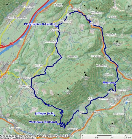 Hier beginnt auch rechts der Steig zum Gipfel des Juffinger Jöchl, den wir in 25 Minuten erreichen könnten. Wir aber bleiben auf dem Hauptweg und fahren wieder bergab. Der Berggasthof Stallhäusl ist in drei Minuten erreicht und lädt zu einer Rast ein. Danach bleiben wir auf der Straße, fahren durch die Weiler Badhaus und Ried, biegen bei der Kreuzung 500 m hinter Ried links ab und radeln leicht ansteigend zum Hotel Alpenschlössl. Bei Reit (769 m) biegen wir nochmals links ab. Weiter geht es über Dorfbichl und schließlich vorbei am idyllischen Moorsee (Fotomotiv), bis wir anschließend zur Hauptstraße (Hauptstraße zwischen Söll und Kufstein) stoßen. Hinter ihr beginnt der schöne Radweg, der hin und wieder parallel zur Autostraße führt, oft aber auch hoch darüber oder weiter entfernt. Wir folgen immer den Wegweisern des Söll-Radwegs, von dem später bei einer Brücke der Radweg nach Schwoich abzweigt. Hier biegen wir rechts ab. Der Radweg führt nun einige Kilometer bis nach Schwoich, direkt zu unserem Ausgangspunkt in der Ortsmitte.