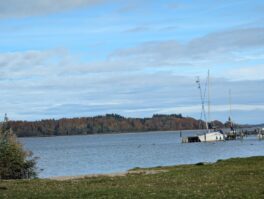 Weiter geht´s auf dem kaum befahrenen Uferweg. Ab und zu glitzert das Wasser zwischen den Bäumen hervor. Nur das Rascheln der Blätter begleitet uns. Im Chiemseepark Felden setzen wir uns auf eine Bank und schauen auf den See, der ruhig und spiegelglatt vor uns liegt. Wer die herbstliche Ruhe am Chiemsee erleben möchte, jetzt ist die richtige Zeit dazu.