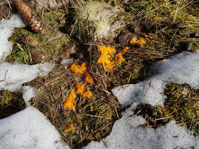 Einen besonderen Pilz hat Maria Schmid aus Zwiesel entdeckt und den Fund bei den Experten im Nationalpark gemeldet – und zwar das Spindelsporige Aggregatbecherchen (Byssonectria terrestris). Die leuchtend-gelborangen Fruchtkörper des Pilzes findet man auf gut gedüngten Stellen im Nadelwald, wo sich gehäuft Rehe oder Hirsche aufhalten. „Es ist bekannt, dass sie nur an uringetränkten Plätzen mit der Schneeschmelze wachsen“, erklärt Karasch. „Im gesamten Böhmerwald sind bislang erst zwölf Plätze bekannt, was sicher auch daran liegt, dass im Frühjahr Wanderer nicht auf Pilze achten.“