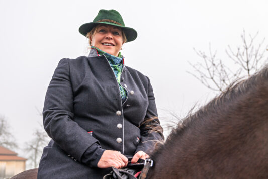 Susanne Grandauer, 1. Bürgermeisterin von Nußdorf, nahm freudig am Leonhardiritt in Roßholzen teil.