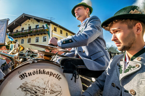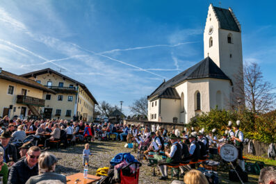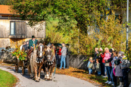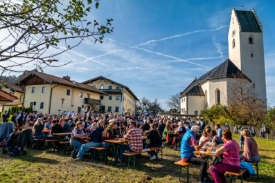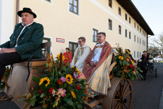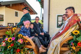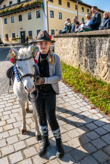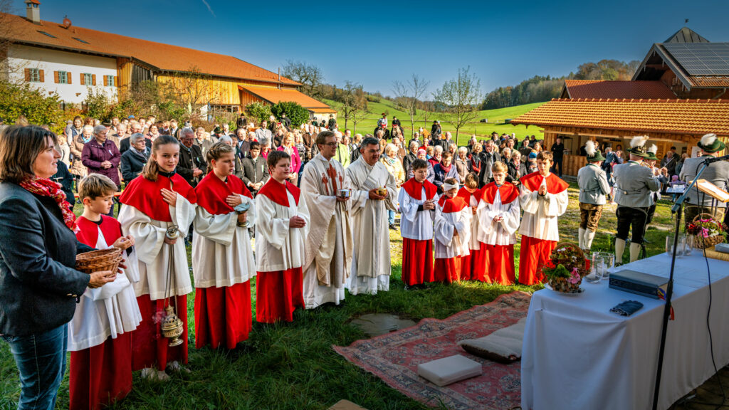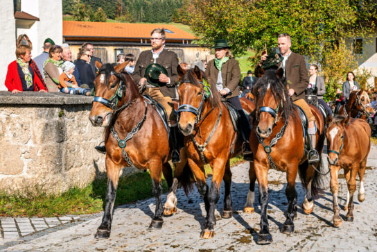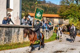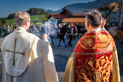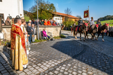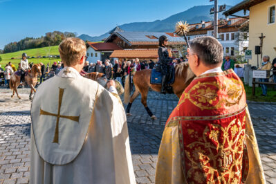 Begleitet wurde die feierliche Zeremonie vom Schnauben der Pferde und dem rhythmischen Klang der Hufeisen, die über den liebevoll geschmückten Dorfplatz hallten. Die Pferde, kunstvoll mit geflochtenen Mähnen und Schweifen geschmückt, trugen Kränze aus Tannenzweigen und leuchtenden Blumen. In zwei festlichen Runden zogen die Reiter um den Dorfplatz und die angrenzenden Straßen, während die Musikkapelle Nußdorf für die musikalische Untermalung sorgte. Der Gottesdienst fand unter freiem Himmel statt, wobei die klare Herbstluft und die herbstlichen Farben dem Ganzen eine ganz besondere Atmosphäre verliehen.
