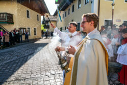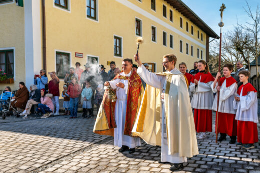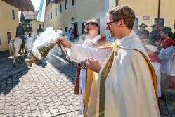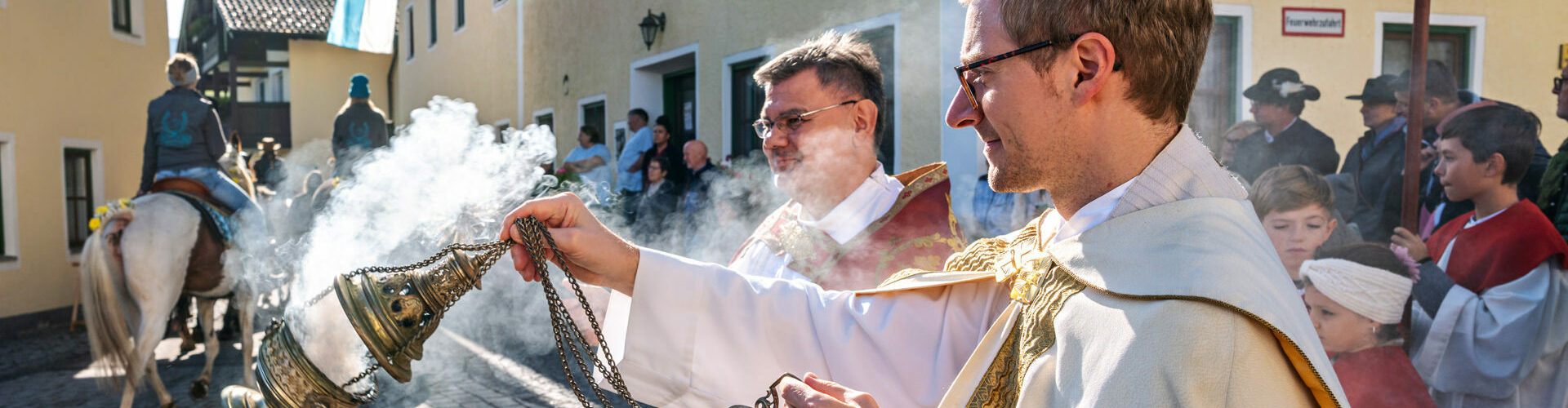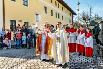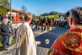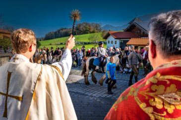 Der Segen für die prachtvoll herausgeputzten Pferde und ihre stolzen Reiter wurde von Priester Tobias Pastötter und Diakon Günter Schmitzberger an der malerisch gelegenen Kirche St. Bartholomäus erteilt. In seiner Predigt widmete sich Pastötter der Lebensgeschichte des heiligen Leonhard und hob dabei besonders dessen tiefen Glauben und Hilfsbereitschaft hervor.
