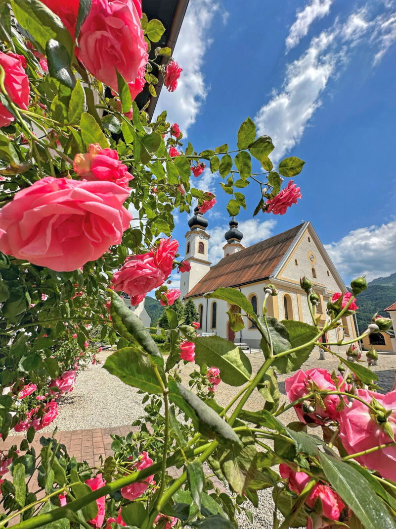In prächtigen und satten Farben blühen derzeit die Rosen auf. Einen besonderen Anblick gibt es derzeit auf die Aschauer Katholische Pfarrkirche „Zur Darstellung des Herrn“, umgarnt vom Rosenzauber am Kirchberg.