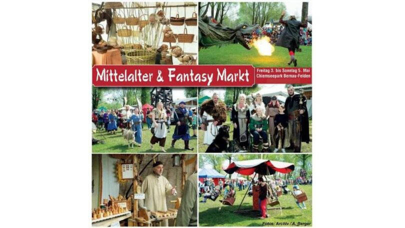 Von Freitag bis Sonntag, 3. bis 5. Mai, verwandelt sich der Chiemseepark Bernau-Felden in einen unterhaltsamen Mittelalter & Fantasy Markt für die ganze Familie. Während des ganzen Tages sorgen zahlreiche „Walking Acts“ für gute Unterhaltung. Mit dabei sind Gaukler, Zauberer und Musiker. Spannende Mitmachaktionen für alle Altersgruppen, wie Armbrustschießen und Axtwerfen sind ebenso geboten wie eine Feuershow, spektakuläre Schwertkämpfe und eine Falknerei. Zahlreiche Stände bieten mittelalterliche Waren an. Für Speis und Trank ist ebenfalls bestens gesorgt. Wer sich voll und ganz in die Atmosphäre des Marktes hineinversetzen möchte, kann den Markt gerne gewandet besuchen.