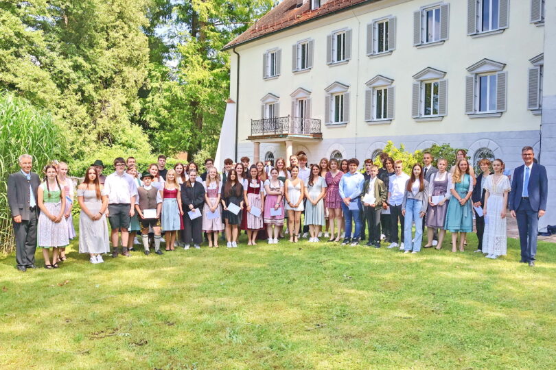 60 Schülerinnen und Schüler der Mittelschulen im Landkreis Rosenheim haben ihren Abschluss mit einem Notendurchschnitt von 1,5 und besser geschafft. Landrat Otto Lederer (links) lud sie deshalb an einen Ort für besondere Gelegenheiten, nach Schloss Hartmannsberg, ein. Zusammen mit Markus Kinzelmann vom Staatlichen Schulamt Rosenheim (rechts) würdigte er sie als besondere Aushängeschilder unseres Landkreises.