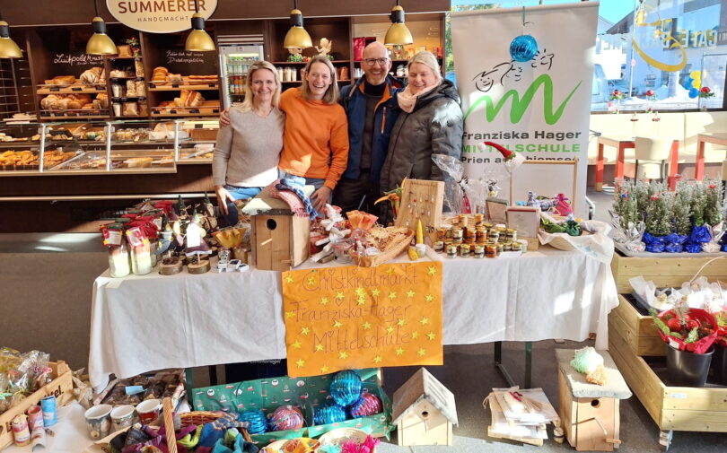 Nachdem vier Tage lang die Ehrenamtlichen des Elternbeirates zusammen mit Lehrkräften und Schülern am Stand nahe dem Heimatmuseum Dienst leisteten, blieben immer noch einige hergestellte und gebastelte Waren übrig. Diese konnten nunmehr an einem Aktionstag dank des Entgegenkommens von Geschäftsführer Selcuk Coban vom EDEKA Markt Coban in der Hochriesstraße angeboten werden. Das Angebot wurde gerne angenommen, so dass es für die Franziska Hager Mittelschule wieder eine Einnahme gab, die für sonst nicht mögliche Anschaffungen verwendet werden kann. Unsere Aufnahmen zeigen einmal den Stand des Elternbeirates am ersten Christkindlmarkt-Wochenende sowie den Aktionstag bei EDEKA Coban. Unter den dankbaren Gästen fanden sich unter anderem auch der vormalige Priener Pfarrer Klaus Hofstetter, Priens Erster Bürgermeister Andreas Friedrich, Mittelschulverbandsrätin Rosi Hell, Carla Fischer von Allkids Prien sowie Martin Aufenanger von der Priener Bürgerwerkstatt ein, die allesamt begeistert von den Aktivitäten der Mittelschule waren.