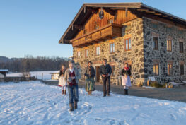 Holz und Natursteine waren jahrhundertelang das Material, aus dem Almhütten und Bauernhäuser gebaut wurden. Holz ist dabei einer der ältesten und natürlichsten Baustoffe der Geschichte. Mit der Eisenerzgewinnung kamen ab dem 16. Jahrhundert in manchen Regionen die Schlackensteine damals als neues Baumaterial dazu. So auch im Rupertiwinkel, wo einige Salzburger und der Probst des Stiftes Höglwörth entschieden, am Teisenberg die dortigen Bodenschätze für den Eisenerzabbau zu nutzen. Sie errichteten im Jahre 1537 ein Eisenerzbergwerk im heutigen Achthal. Schlacke fällt als Abfall- bzw. Nebenprodukt bei der Eisenerzgewinnung an. Je niedriger der Eisengehalt der Abbaustätte, desto höher der nichtmetallische Anteil, die Schlacke. Der doch eher geringe Eisenerzanteil von unter 25% führte letztendlich auch dazu, dass um 1925 das Achthaler Erzwerk den Betrieb am Teisenberg wieder einstellte. Die Schlacke kommt flüssig bei rund 1.400 °C als Nebenprodukt aus dem Schmelzofen und quillt beim Abschrecken mit kaltem Wasser auf das 5-10fache Volumen auf. Das so entstandene Baumaterial – der meist schwarz bis anthrazitfarbene Schlackenstein – ist sehr porös und dank der Lufteinschüsse sehr leicht und gut bearbeitbar. Aufgrund der damit verbundenen guten Isoliereigenschaft, die mit Ziegelsteinen vergleichbar ist, wurden die Schlackensteine bevorzugt zum Hausbau verwendet. Besonders Anfang des 20. Jahrhunderts wurden die Schlackensteine als günstiges Baumaterial nördlich vom Teisenberg vielfach eingesetzt, so auch für das 1909 erbaute Bauernhaus der Ramstetters in Kleinrückstetten. Neben vielen Bauernhäusern wurden auch z.B. Bahnhofsgebäude, wie der Bahnhof Bergen/Obb. an der Eisenbahnstrecke München–Salzburg, oder die 1912 stillgelegte Saline in Traunstein mit Schlackensteinen gebaut. Aufgrund der wasserabweisenden Eigenschaft der Schlackensteine wurden die Mauern ursprünglich nicht verputzt. Viele der Häuser wurden allerdings später – der Mode entsprechend – verputzt. Doch auch heute findet man rund um Teisendorf immer noch alte Bauernhäuser mit dem charakteristischen gescheckten unverputzten Mauerwerk. Die Schlackensteine wurden dabei vielfach kunstvoll mit Natursteinen gemischt und die Fensterstürze mit Ziegel eingebaut. Diese Bauernhäuser sind im heutigen Rupertiwinkel prägend für das Landschaftsbild und stehen dementsprechend unter Denkmalschutz. Dank der guten Isoliereigenschaften lässt es sich auch heute noch gut darin wohnen. Josef Ramstetter ist einer von rund 1.800 Landwirten der Molkereigenossenschaft Berchtesgadener Land. So wie er wohnen viele bäuerliche Familien in historischen Gehöften quasi im Mehrgenerationenhaus mit Jung und Alt zusammen. Während die Altenteiler im Parterre wohnen, leben Martina, Josef und die drei Kinder Maria, Julia und Andreas im ersten Stock und haben zusätzlich das Dachgeschoss für sich ausgebaut.