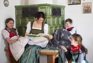 Martina Ramstetter und ihre Kinder genießen die wohlige Wärme, die der Kachelofen spendet.