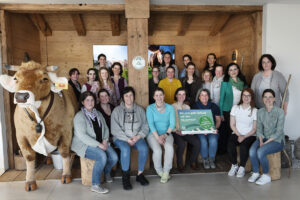 Sieglinde Bittl vom Ministerium für Ernährung, Landwirtschaft und Forsten (2. Reihe, 2. von rechts stehend) und Katharina Walch (2. Reihe, rechts außen, stehend), ausgebildete Erlebnisbäuerin aus Bischofswiesen, stellten den 19 teilnehmenden Landwirtinnen im Rahmen der Wissenswerkstatt der Molkerei Berchtesgadener Land die Entwicklung zum Erlebnisbauernhof vor. Mit im Bild: Eva Lederer (rechts außen) und Jordana Kern (2. von rechts außen) von der Molkerei Berchtesgadener Land. Bildquelle: Molkerei Berchtesgadener Land