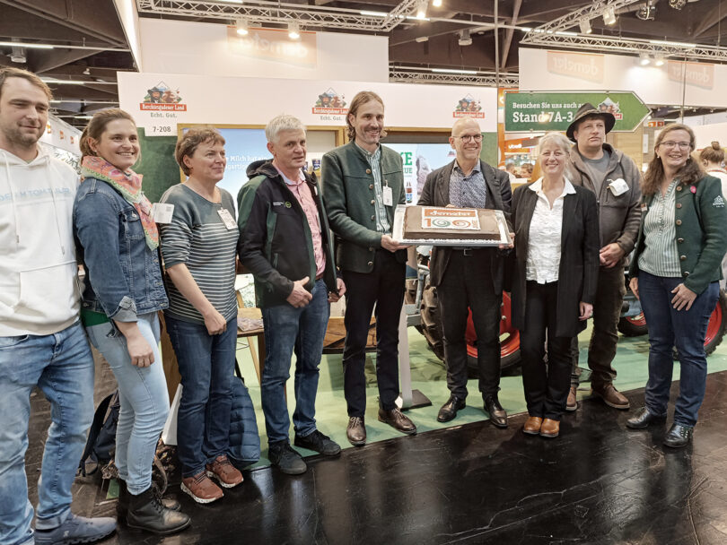 Mit einer Geburtstagstorte zu 100 Jahren biodynamischer Landwirtschaft überraschte die Molkerei Berchtesgadener Land den Demeter-Verband. Gebacken in Piding brachten über 40 Bio-Landwirt:innen der Genossenschaft die natürlich mit Demeter- und Bio-Zutaten gebackene Sachertorte persönlich aus dem Berchtesgadener Land zur Messe nach Nürnberg. Dort wurde sie am Demeter-Stand feierlich Demeter-Vorstand Alexander Gerber übergeben. Bernhard Pointner, Geschäftsführer der Molkerei Berchtesgadener Land betonte dabei: „Die Kreislaufwirtschaft, das Grundelement der biodynamischen Landwirtschaft, ist heute nach 100 Jahren aktueller denn je und ist das zentrale Element der Nachhaltigkeitsstrategie der Molkereigenossenschaft, mit der wir 2024 zum zweiten Mal den Deutschen Nachhaltigkeitspreis gewonnen haben.“ Alexander Gerber bedankte sich ganz herzlich für die Torte, aber besonders für die 50-jährige Zusammenarbeit. Als erste Molkerei habe Berchtesgadener Land bereits 1973 damit begonnen Demeter-Milch von 5 bio-dynamischen Höfe abzuholen und separat zu verarbeiten. Der Beginn der Demeter-Milchprodukte-Vermarktung. Im Anschluss wartete ein geführter Rundgang zu Akteuren der Bio-Lieferkette auf die angereisten Landwirt:innen. Besucht wurden die Messestände der Anbauverbände Demeter und Naturland, des Bio-Krunchy-Lieferanten Barnhouse, der Großhändler Ökoring und Dennree sowie der Stand eines der Zertifizierer.