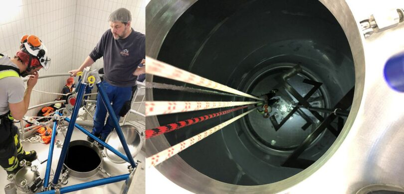 In der Molkerei Berchtesgadener Land werden täglich rund 1 Million Kilogramm Milch angeliefert. Für die Lagerung der Rohmilch und deren Zwischenprodukten stehen rund 150 zwischen zwei und 20 Meter hohe Tanks zur Verfügung. Sowohl beim Begehen der Tanks an den Außenleitern als auch im Innenraum könnten Mitarbeiter in Not geraten. Genau diese Situationen wurden bei der kürzlich auf dem Molkereigelände in Piding durchgeführten Übung durchgespielt.