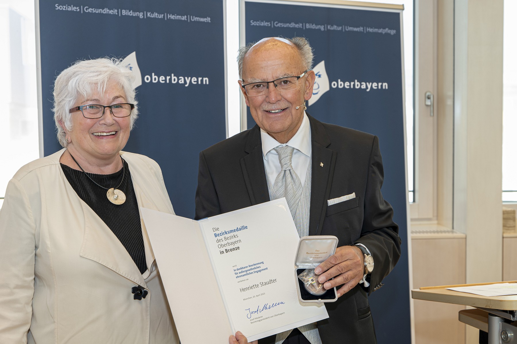 Verleihung der Bezirksmedaille: Bezirkstagspräsident Josef Mederer (rechts) ehrt Henriette Staudter
