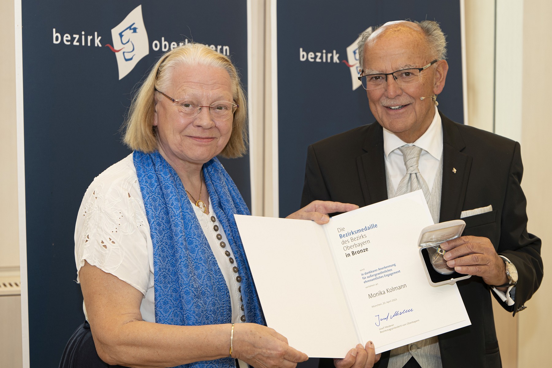 Verleihung der Bezirksmedaille: Bezirkstagspräsident Josef Mederer (rechts) ehrt Monika Kolmann