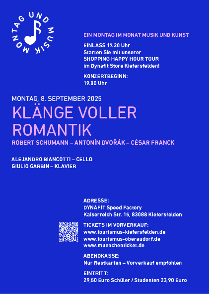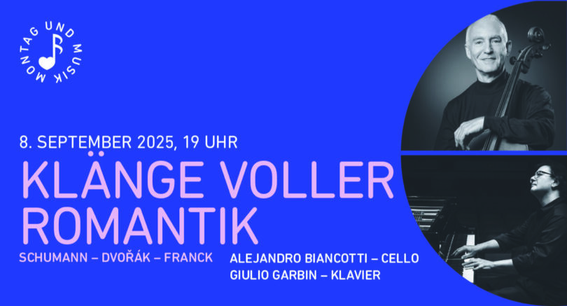 Informationen für das nächste Konzert von MONTAG UND MUSIK in Kiefersfelden – am 8. September 2025: Klänge voller Romantik. Zwei wundervolle Musiker! Alejandro Biancotti (Violoncello) und Giulio Garbin (Klavier). Zeiten und Preise bleiben immer gleich.