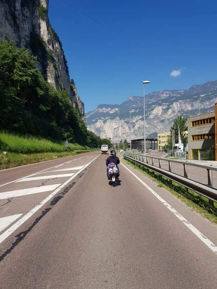 Nach einer kurzen Quartiersuche hat uns a sehr netter, älterer Herr glei sei ganze Ferienwohnung angeboten. Unsa Gepäck war schnell verstaut und nach dera langen Mopedfahrt ham ma dann unsa erste Pizza in Bella Italia genießen können. Am nächsten Tag ist dann die zweite Etappe von unserer Tour angstanden. Mit schmerzendem Hintern und nimma ganz so viel Freude ham ma uns trotzdem wieder aufn Sattel geschwungen und san losgefahren. Zum Teil auf großen Landstraßen, die scho fast Autobahncharakter gehabt haben, ham mia uns gegen den ein oder anderen LKW im Tunnel durchsetzen müssen. Nichts desto trotz ham wir dann um Punkt 12 Uhr mittags unser großes Ziel erreicht. Mia warn endlich am Gardasee, Torbole.
