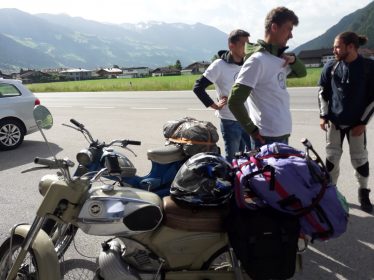 Um 8 Uhr morgens, bei einem Mix aus Wolken und a paar vereinzelten Sonnenstrahlen ging es dann endlich los. Im Vorhinein hat`s uns, bzw. den bis zu 60 Jahre alten Mopeds, kaum einer im Familien-/und Freundeskreis zugetraut, dass mia überhaupt bis nach Österreich, geschweige denn bis zum Gardasee kemman. Demnach war unsa Aufregung an dem Morgen beim Start der Motoren natürlich a ziemlich groß. Trotzdem ham mia uns voller Vorfreude und Hoffnung Richtung Grenze bei Sachrang aufgmacht, die ma dann auch nach oana knappen Stund hinter uns glassn ham. Unser erstes Zwischenziel war erricht. Gegen 10 Uhr hats dann die erste Brotzeit in Form von einer Leberkassemmel kurz hinter Kufstein gem. Frisch gestärkt gings dann, mit einem kurzen halt bei da Tankstelle weida Richtung Innsbruck.