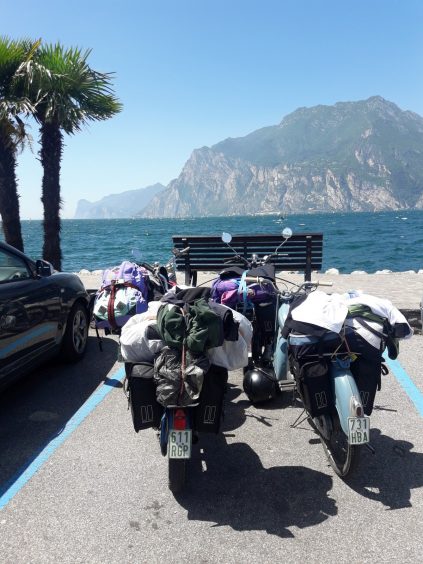 Mia warn glücklich wie kleine Kinder an Weihnachten, koana daheim hat`s uns geglaubt, alle ham`s gsagt “Ihr spinnt`s ja, des schafft`s ihr nie”. Aber jetz warn ma wirklich da. Gut gelaunt und nach einer Stärkung zu Mittag, san mia dann die restlichen Kilometer entlang am türkisblauen Wasser vom Gardasee zu unserem Quartier in Bardolino gefahren. Mia warn so froh, dass ma die nächsten Tage ned auf dem Mopedsattel ham sitzen müssen. Nach einer Woche Erholung, Strand, Spaß, kleineren Ausflügen mit den Mopeds und dem ein oder anderen Bier am Capingplatz war dann wieder Heimfahrt angesagt.