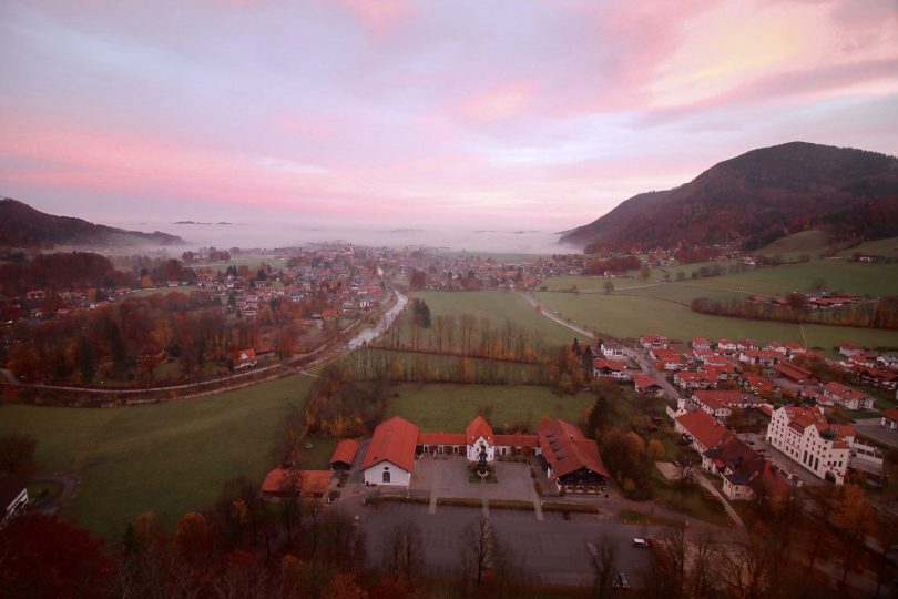 Dicke Nebelschwaden kämpfen sich durch das Priental und auf einmal ziehen die weißen Massen in das Nichts ab. Langsam räkelt sich die Sonne in den frühen Morgenstunden über die Kampenwand und zaubert ein rosiges Farbenspiel. Vom Schloss Hohenaschau hat man diesen traumhaften Blick auf den noch schlummernden Ort Aschau i.Chiemgau. Es ist ein Geschenk, wenn triste November-Tage zum strahlenden Augenschmaus werden.