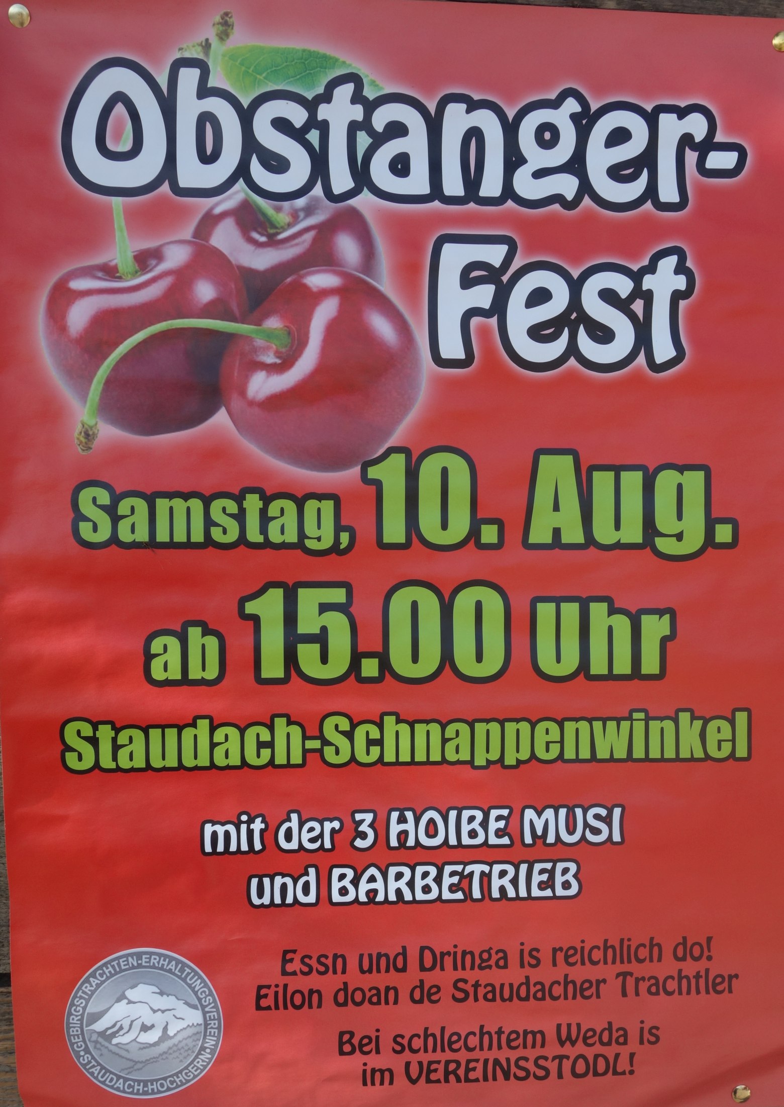 Am morgigen Samstag, den 10. August 2019, findet ab 15 Uhr das Obstanger-Fest in Staudach-Schnappenwinkel statt. Zur musikalischen Unterhaltung spielt die 3 Hoibe Musi. Veranstalter ist der Trachtenverein “Hochgern” Staudach.