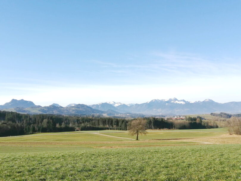 Eine wohltuende Morgenstimmung herrschte dieser Tage im Rosenheimer Land – wie unsere Aufnahme mit den Weiten der Felder und den noch schneebedeckten Bergen zeigt.