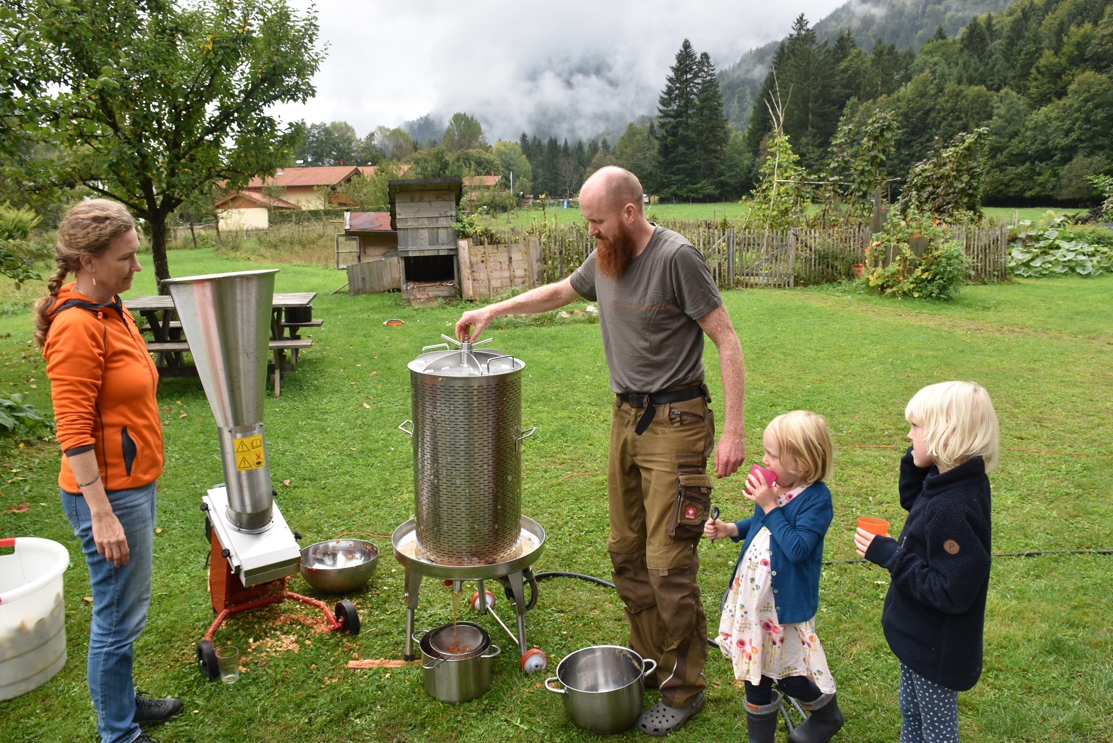 Hier rinnt der reine Apfelsaft unten aus der Hydro-Presse Von links Martina Hammerl-Tiefenböck, der Häcksler, die Hydro-Presse, Christian Wimmer und seine Töchter Josepha und Mathilda
