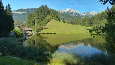 Hier beginnt auch rechts der Steig zum Gipfel des Juffinger Jöchl, den wir in 25 Minuten erreichen könnten. Wir aber bleiben auf dem Hauptweg und fahren wieder bergab. Der Berggasthof Stallhäusl ist in drei Minuten erreicht und lädt zu einer Rast ein. Danach bleiben wir auf der Straße, fahren durch die Weiler Badhaus und Ried, biegen bei der Kreuzung 500 m hinter Ried links ab und radeln leicht ansteigend zum Hotel Alpenschlössl. Bei Reit (769 m) biegen wir nochmals links ab. Weiter geht es über Dorfbichl und schließlich vorbei am idyllischen Moorsee (Fotomotiv), bis wir anschließend zur Hauptstraße (Hauptstraße zwischen Söll und Kufstein) stoßen. Hinter ihr beginnt der schöne Radweg, der hin und wieder parallel zur Autostraße führt, oft aber auch hoch darüber oder weiter entfernt. Wir folgen immer den Wegweisern des Söll-Radwegs, von dem später bei einer Brücke der Radweg nach Schwoich abzweigt. Hier biegen wir rechts ab. Der Radweg führt nun einige Kilometer bis nach Schwoich, direkt zu unserem Ausgangspunkt in der Ortsmitte.