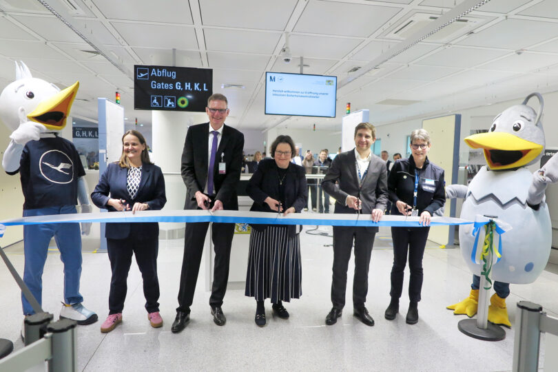 Bericht und Foto: Regierung von Oberbayern / Flughafen München – Regierungsvizepräsidentin Friederike Fuchs (M.) eröffnet gemeinsam mit den Geschäftsführern der T2 Gesellschaft, Ivonne Kuger (l.) und Matthias Langbehn (2.v.r.), dem Direktor der Verwaltung des Bezirks Oberbayern, Dr. Wolfgang Bruckmann (2.v.l.), und der Leiterin des Luftamts Südbayern, Monika Goriß (r.), die neue inklusive Kontrollstelle im Terminal 2 des Flughafens München.