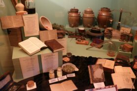 - Fachliteratur und Apothekergerät aus der Zeit um 1800 in den Ausstellungsräumen im dritten Stock der Alten Schule