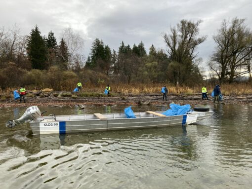Einmal im Jahr sammeln Mitarbeiter der Flussmeisterstelle Salzach Müll in der Hirschauer Bucht am Chiemsee. An zwei oder mehr Tagen fahren sie mit einem Boot hinüber ins Naturschutzgebiet, um aufzulesen was andere einfach weggeworfen haben. Eine mühsame, nicht ungefährliche Arbeit.