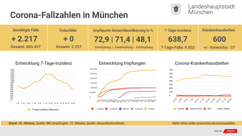 Für München wurden am Dienstag, 18. Oktober, vom Robert Koch-Institut (RKI) 2.217 neue Corona-Fälle und kein weiterer Todesfall gemeldet. Insgesamt sind in der Landeshauptstadt damit bislang 683.427 Infektionen und 2.257 Todesfälle bestätigt (corona.rki.de -> Landkreise -> SK München).