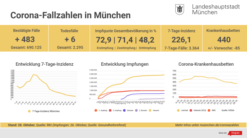 Für München wurden am Freitag, 28. Oktober, vom Robert Koch-Institut (RKI) 483 neue Corona-Fälle und 6 weitere Todesfälle gemeldet. Insgesamt sind in der Landeshauptstadt damit bislang 690.125 Infektionen und 2.295 Todesfälle bestätigt (corona.rki.de -> Landkreise -> SK München).