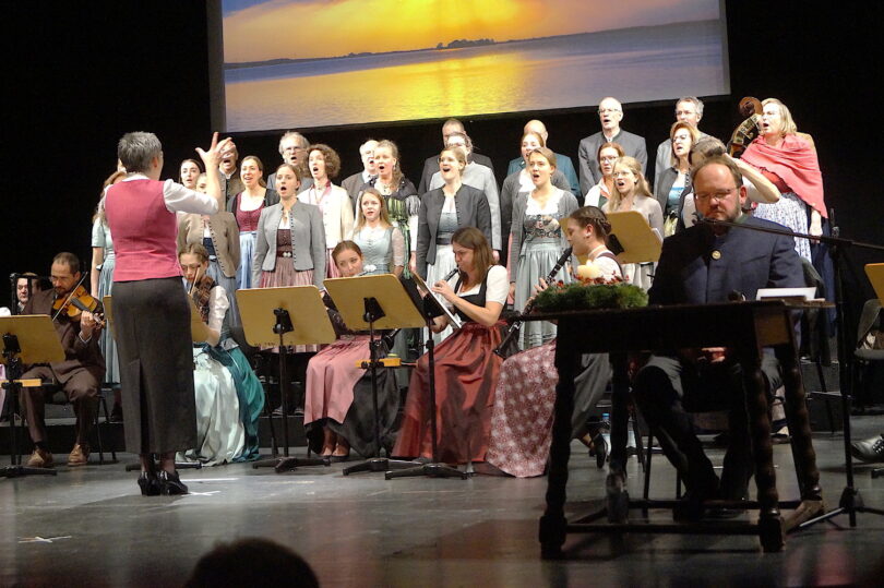 Wie durch ein Fenster blickte man an der Bühnenrückwand auf stimmungsvolle Landschaften, Sonnenuntergänge oder Krippenszenerien. Die Lichtspots auf der Bühne wanderten übergangslos von einer Gruppe zur anderen, auch die Volksweisen und Lieder flossen ineinander über – mit instrumentalen Einleitungen, Zwischenspielen und Abschlüssen. Alle Musiker erzählten die gleiche Geschichte vom Licht des Erlösers unter einem anderen Blickwinkel – aus der Sicht der Hirten oder Marias, des Wirts und der drei Weisen – und mit jeweils anderen musikalischen Mitteln, die nur durch den Sprecher (Andreas Estner, Journalist und Moderator beim Bayerischen Rundfunk) bisweilen ergänzt wurden. Die Instrumentalgruppen „Ensemble Sabiona“ mit Zither, Gitarre und Harfe (Moritz Demer), die „Laubensteiner Bläser“ mit zwei Flügelhörnern, Basstrompete und Tuba, sowie das Ensemble des Münchner Advent mit ebensolchen Vollblutmusikern an Geige, Bratsche, Violoncello, Oboe, Querflöte, Klarinette und Harfe, sowie Kontrabass spannten gemeinsam den roten, musikalischen Faden und begleiteten den „Duschlhof G’sang“ mit vier Familienmitgliedern, die Gruppe „Trifarbig“ und den Chor des Münchner Advent unter der Leitung von Herta Albert. Authentisch und glaubwürdig erklang die Botschaft der echten und wertvollen Volksmusik in all ihren Facetten, mal zart im Drei- oder Vierg’sang, mal kräftig im Chor, in dem auch ein Tenorsolist sein Talent zeigte. Durch die hervorragende Klangqualität und die inhaltlich bedeutungsvolle biblische Erzählung verbreitete sich im Saal eine meditative Stille.