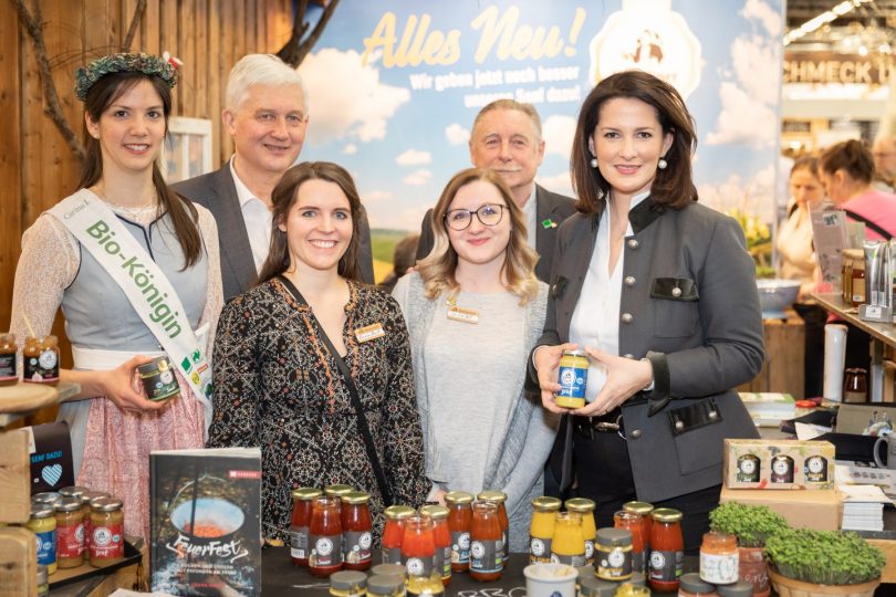 Bei ihrem Rundgang über die internationale Fachmesse BIOFACH in Nürnberg hat Landwirtschaftsministerin Michaela Kaniber (r.) auch am Stand von Münchner Kindl Senf vorbeigeschaut. Geschäftsführer Theo Hartl (2.v.r.) und seine Töchter Lisana (2.v.l.) und Catalina informierten die Ministerin über die breite Produktpalette des Senf-Spezialisten aus Fürstenfeldbruck. Mit rund 25 Sorten werden mittlerweile 90 Prozent der Produkte auf Basis ökologischer Rohstoffe aus der Region hergestellt. Mit dabei war auch Bioland-Vorsitzender Josef Wetzstein (l.).