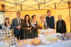 Bild zeigt die Ministerin (l.) mit v. l. Bauernverbands-Vizepräsident Günther Felßner, der frisch gekürten Bayerischen Bio-Königin Carina Bichler, der Bayerischen Honigkönigin Katharina Eder sowie Christian Engelschall und Brynja Winter (Bienenhof Engelschall).