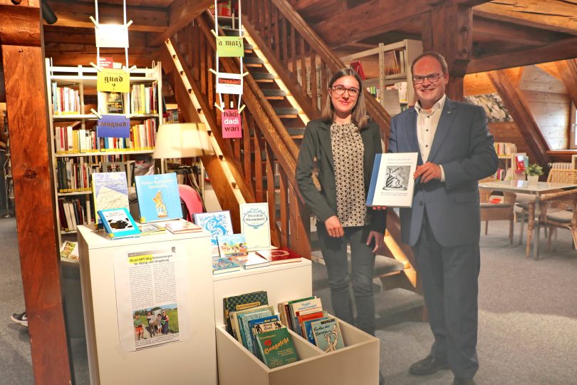 Foto: Prien Marketing GmbH – Büchereileiterin Melanie Schieber bedankt sich bei dem Ersten Bürgermeister der Marktgemeinde Andreas Friedrich für die Buchspende. Damit der heimische Dialekt nicht in Vergessenheit gerät und noch lange in aller Munde bleibt, bereichert ab sofort das Buch „De boarische Gschicht – A Streifzug durch de Jahrhundate“ das Sortiment der Bücherei Prien.