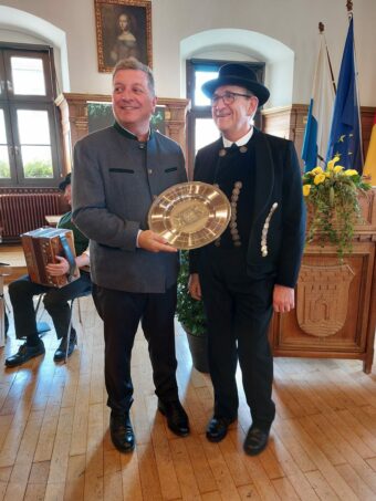 Bildunterschrift: Der Bayerische Staatsminister Christian Bernreiter zeichnet Siegfried Bradl mit dem von Minister Söder gewidmeten „Bayerischen Poetenteller“ aus (v.li.).