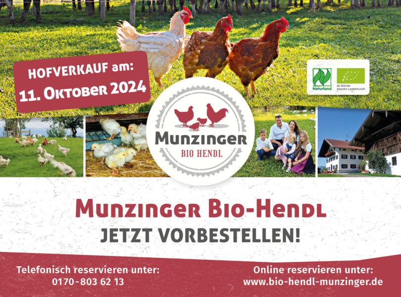 Am Freitag, 11. Oktober gibt es wieder den Hofverkauf von Munzinger Bio-Hendl in Prien-Munzing. Bereits jetzt besteht die Möglichkeit, über die Internetseite www.bio-hendl-munzinger.de online zu reservieren.