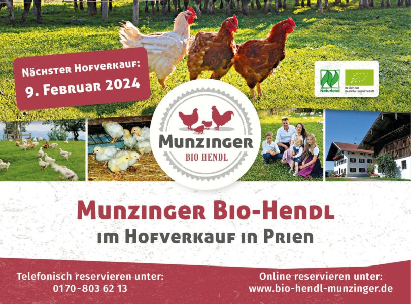 Die Familie Mayer lädt herzlich ein, am Freitag, 9. Februar 2024, frische Naturland Bio-Hendl vom hauseigenen Munzingerhof in Prien-Munzing (nur nach Reservierung / Vorbestellung) abzuholen.