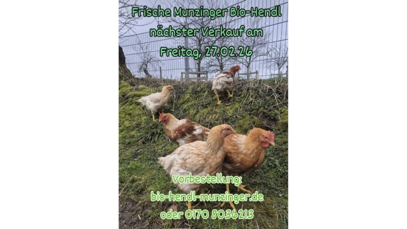 Vorbestellungen sind unter bio-hendl-munzinger.de oder telefonisch unter 0170 / 8036213 möglich.