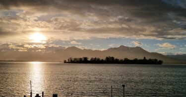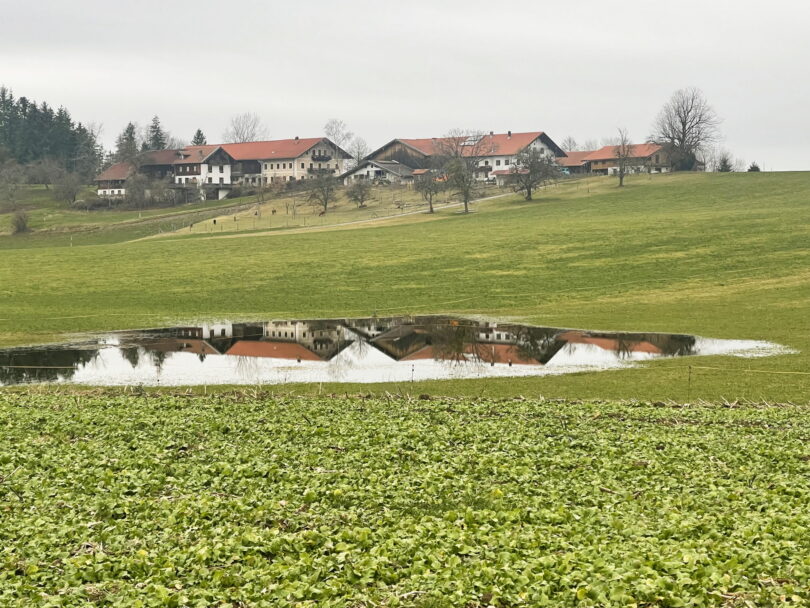 Die Niederschläge der letzten Zeit machen es möglich, dass Wanderer im Westen der Gemeinde Prien manch besondere Einblicke in die Dörfer und Landschaften bekommen – so nahe dem Ort Elperting, dort spiegelt sich das Nachbardorf Mupferting in einem vorübergehend Wasserflecken.