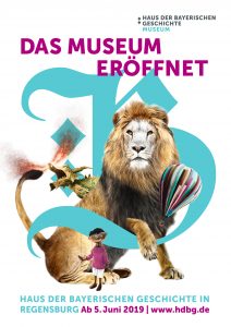 © Haus der Bayerischen Geschichte, Entwurf Peter Schmidt Group München, unter Verwendung folgender Motive: Augsburger Puppenkiste © Augsburger Puppenkiste ® Foto: Elmar Herr; Further Drache © Tourist-Information Furth im Wald | Foto: Andreas Mühlbauer; Fluchtballon © Günter Wetzel; Löwe © Dennis Jacobsen / shutterstock.com.