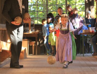 Am Sonntag können Besucherinnen und Besucher auf der historischen Kegelbahn am Salettl kegeln wie anno dazumal (14 bis 15 Uhr), das heißt mit Holzkugeln und -kegeln, auch das Aufstellen der Kegel erfolgt von Hand! Mit den eigenen Händen wird auch in der Seilerei gearbeitet: Dort braucht Seilerin Edith Propst Hilfe beim Drehen von Kälberstricken (13 bis 14 Uhr).