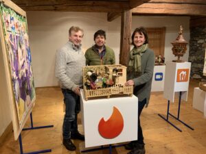 V.l.: Christian Vötter, Peter Fritzenwallner und Susanna Vötter-Dankl freuen sich über die gelungene Ausstellung. Volkskultur bzw. naive Volkskunst mit zeitgenössischen Elementen verwoben.